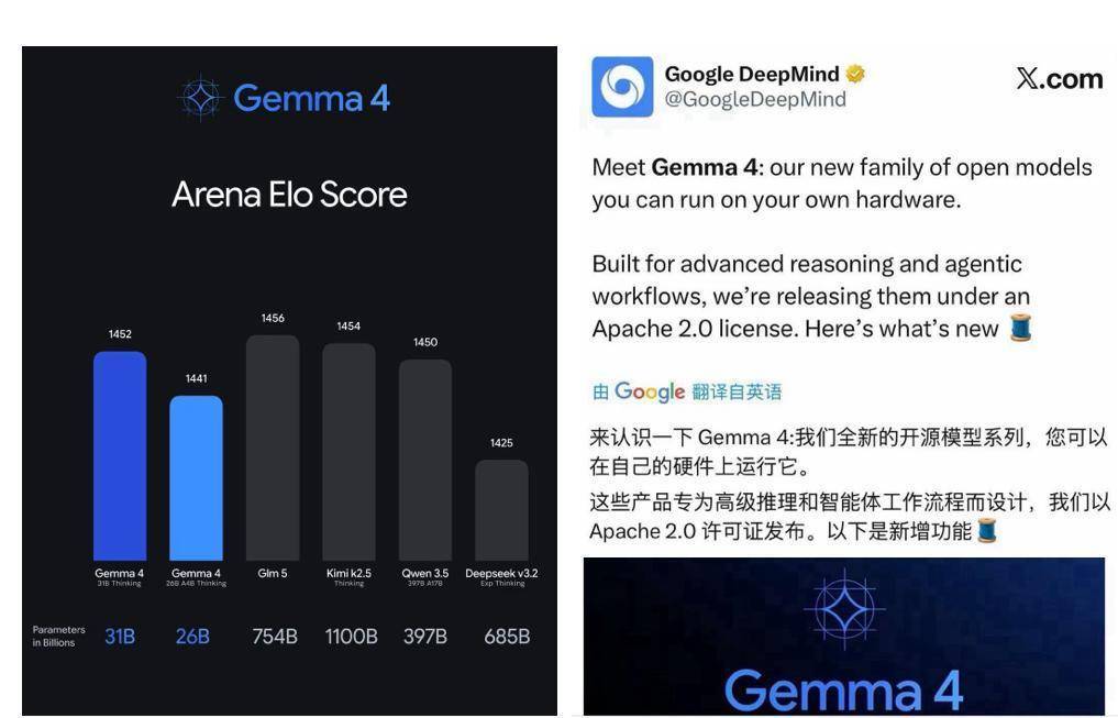 谷歌 DeepMind 正式发布 Gemma 4 开源模型系列,给整个 AI 行业投下了一颗重磅炸弹。这款专为高级推理和智能体工作流设计的模型,以 Apache 2.0 许可开源,支持用户在自有硬件上本地运行,彻底打破了本地部署大模型的算力壁垒。